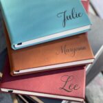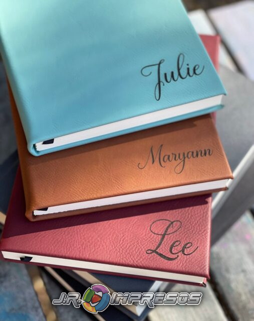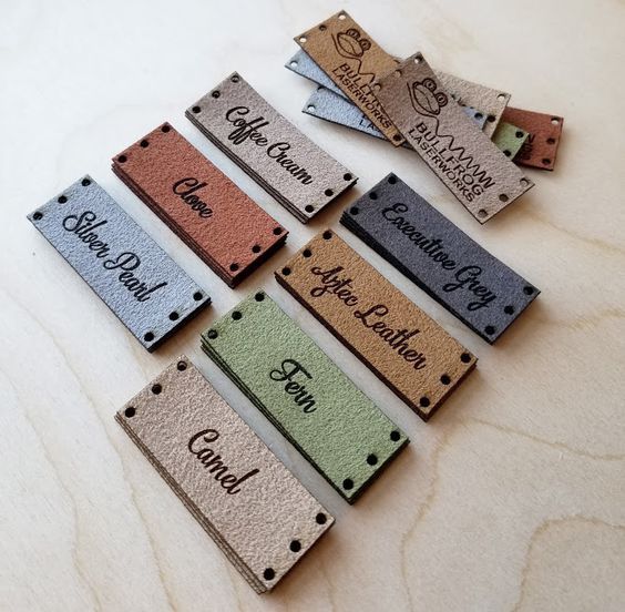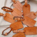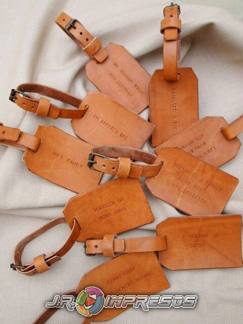 Etiquetas con nombres personalizados en material de piel con grabado láser.